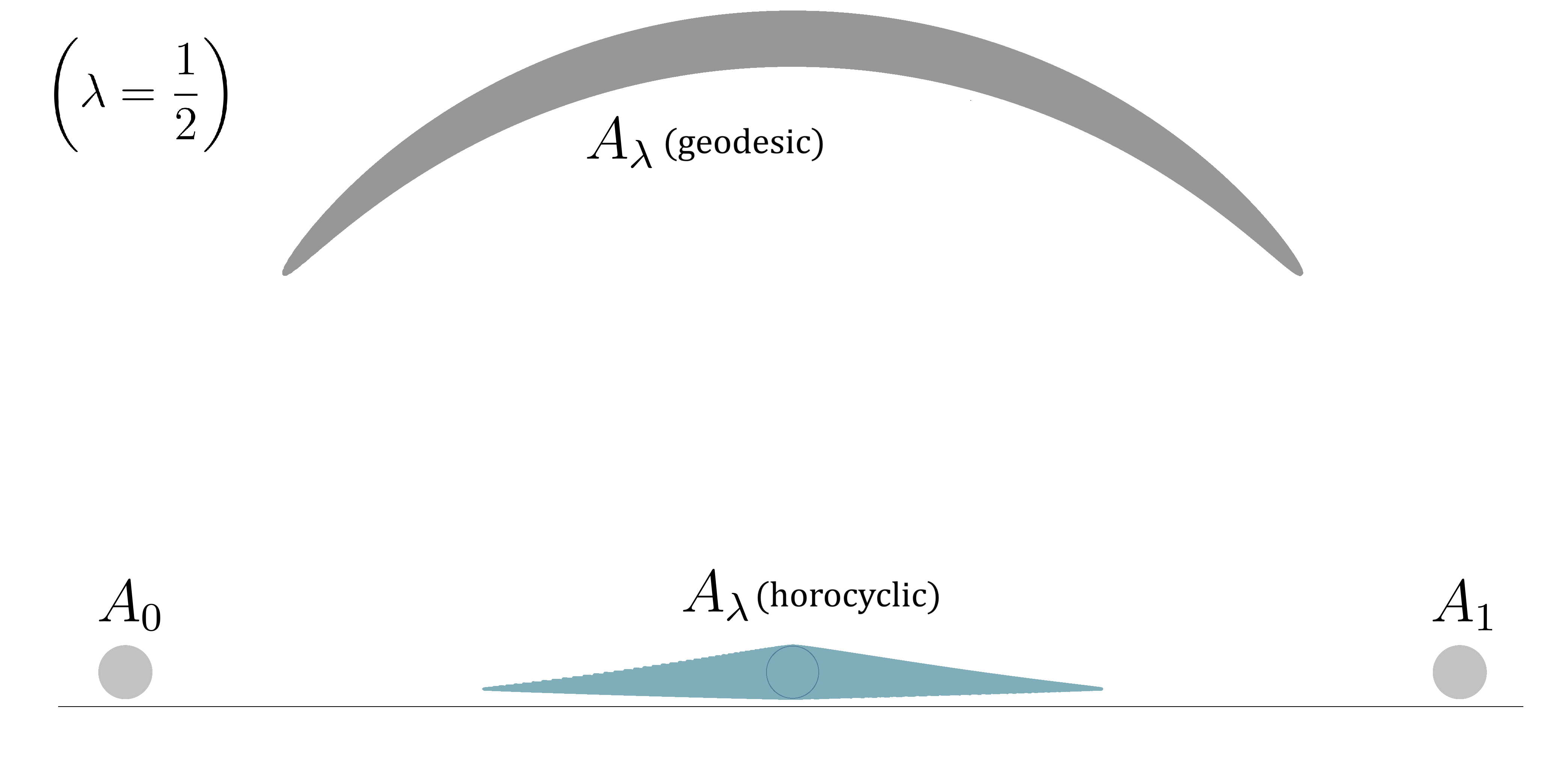 Theorem (A.-Klartag '22, A. '25): Let \(A_0,A_1 \subseteq \mathbb{C}\mathbf{H}^d\) be Borel sets of positive measure and let \(0\le\lambda\le 1\) . Denote by \(A_\lambda\) the set of points of the form \(\gamma(\lambda \ell)\) , where \(\gamma:[0,\ell]\to \mathbb{C}\mathbf{H}^d\) is a horocycle satisfying \(\gamma(0) \in A_0\) and \(\gamma(\ell) \in A_1\) . \[\implies \qquad \mathrm{Vol}(A_\lambda)^{1/n} \ge (1-\lambda)\cdot\mathrm{Vol}(A_0)^{1/n} + \lambda\cdot\mathrm{Vol}(A_1)^{1/n}, \] where \(\mathrm{Vol}\) denotes the hyperbolic volume measure and \(n = 2d\) .